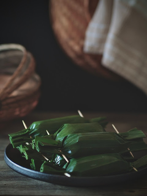 3) 将一份糯米饭放在剪好的香蕉叶上, 放两小匙馅料在中间,然后用香蕉叶卷起成长条型。 两端用牙签穿上稳固。